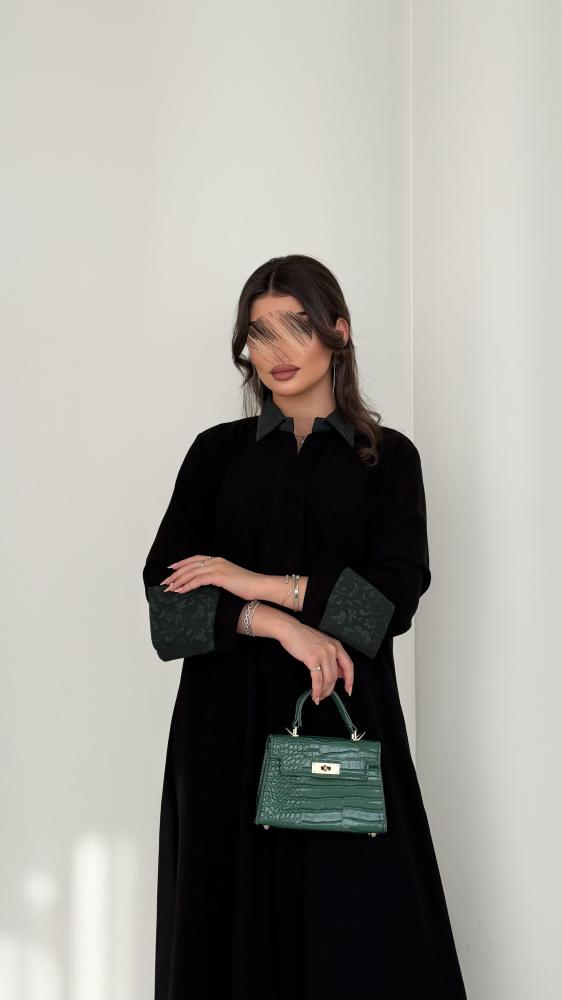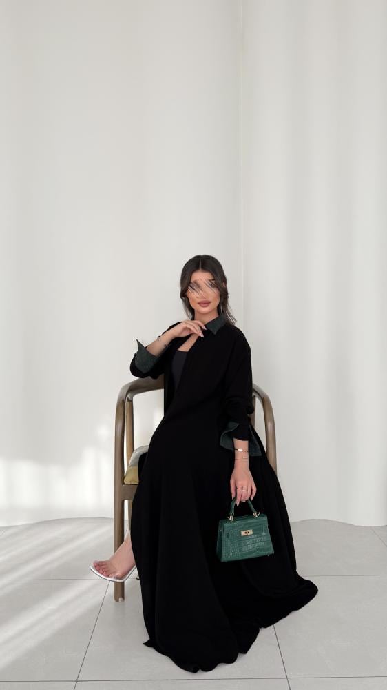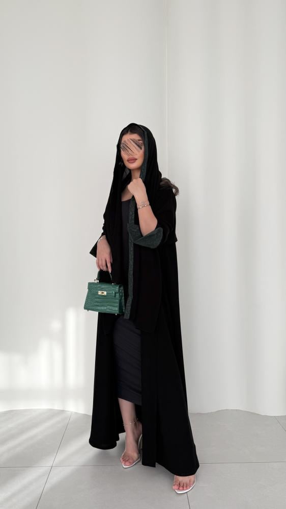 •عبـاية من قمـاش الكريـب الملكي الاسود بإضـافة تدخيلات من قمـاش كريب شكيـرا الاخضـر بتشجيرة مميزة.