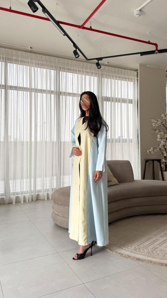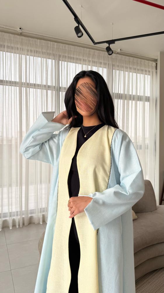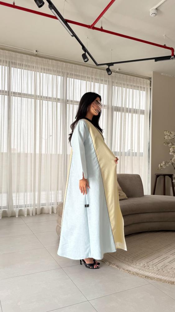 - عباية من قماش اللينن الهندي باللون السماوي واللون الأصفر مع تطريز خاص