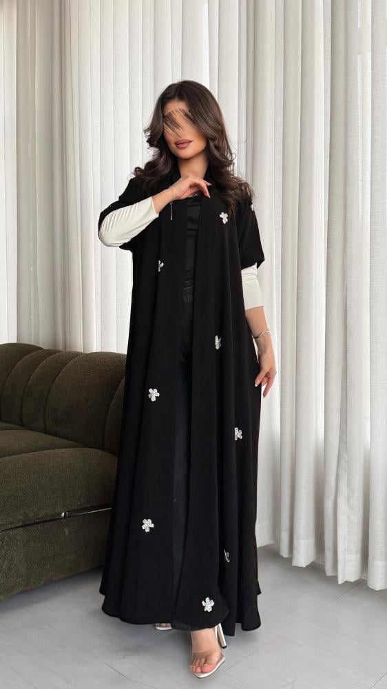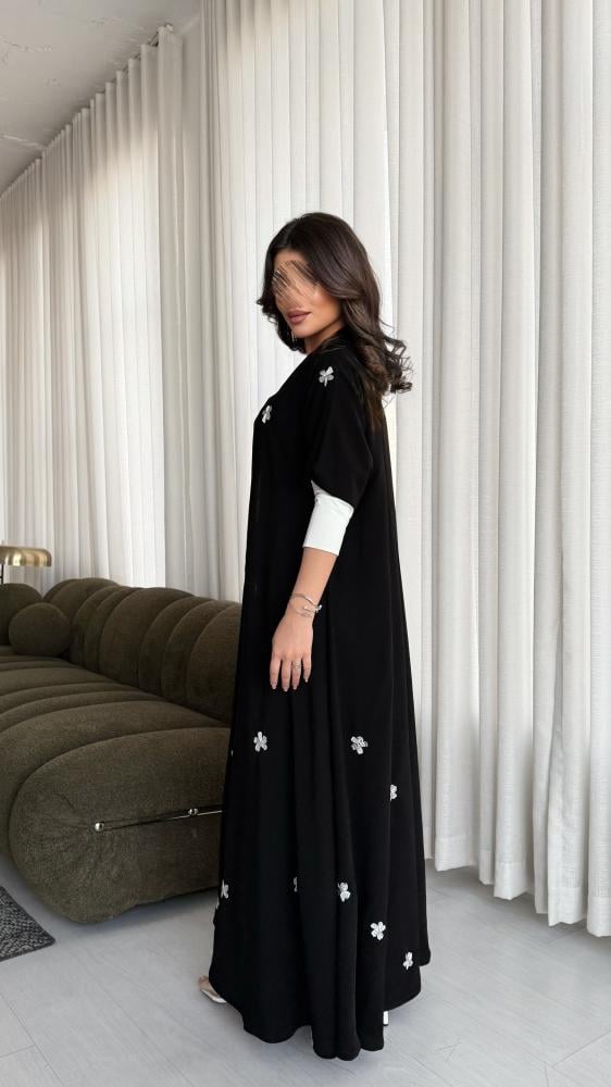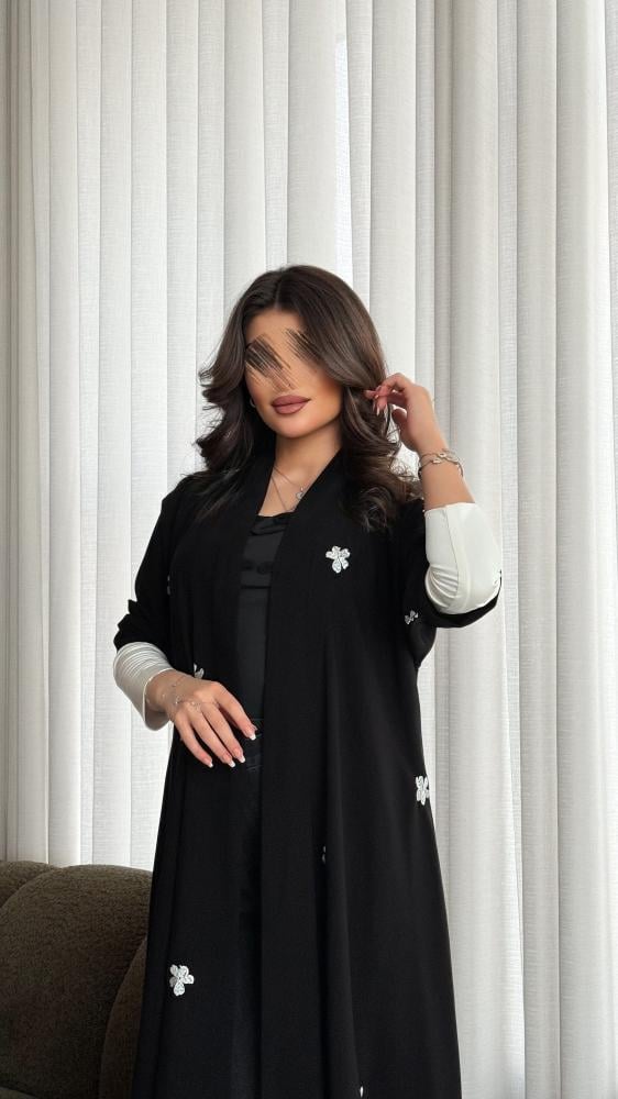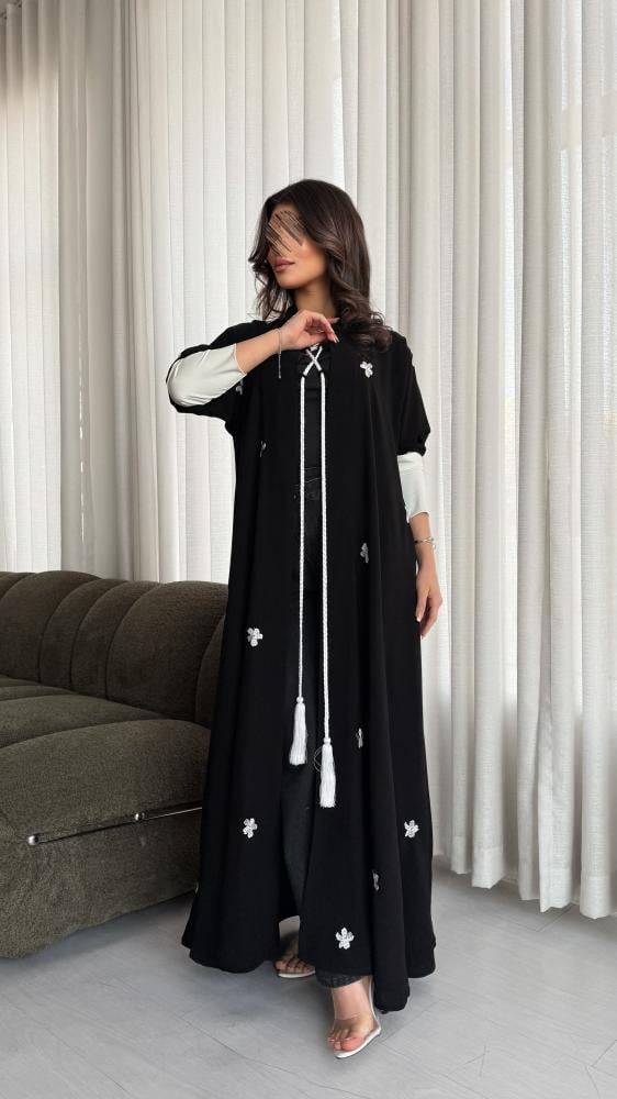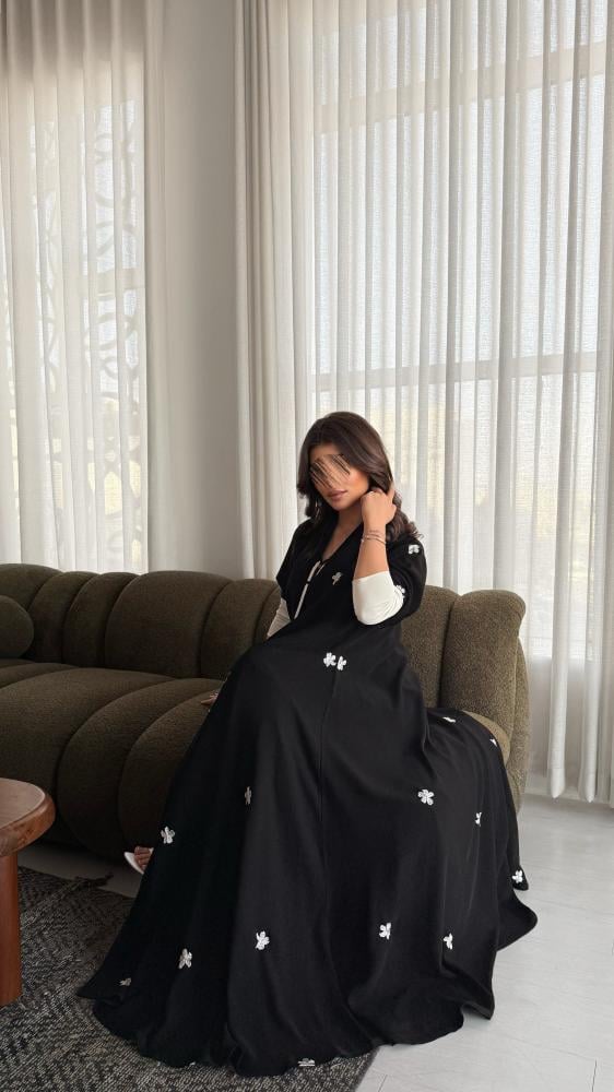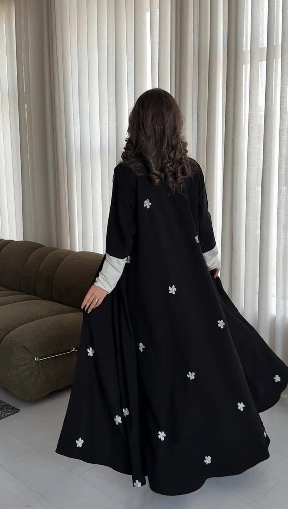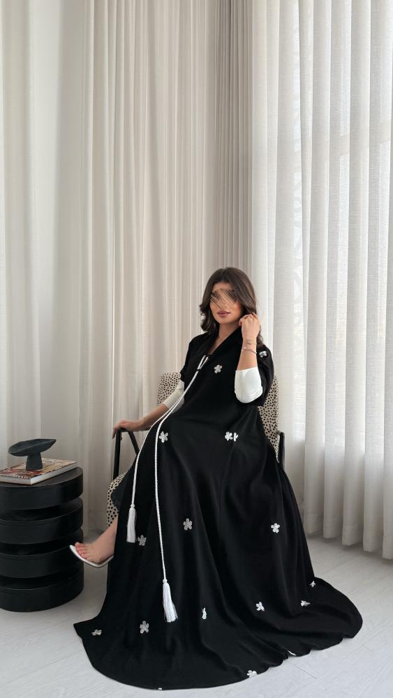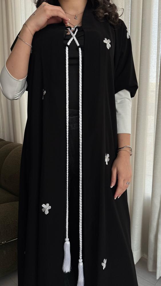 •عبــاية من قماش الكريب الاســود مطــرز بالــورود باللون الابــيض، تُكملها دندوشه أمامية بيضاء، اكــمام استرتـش.